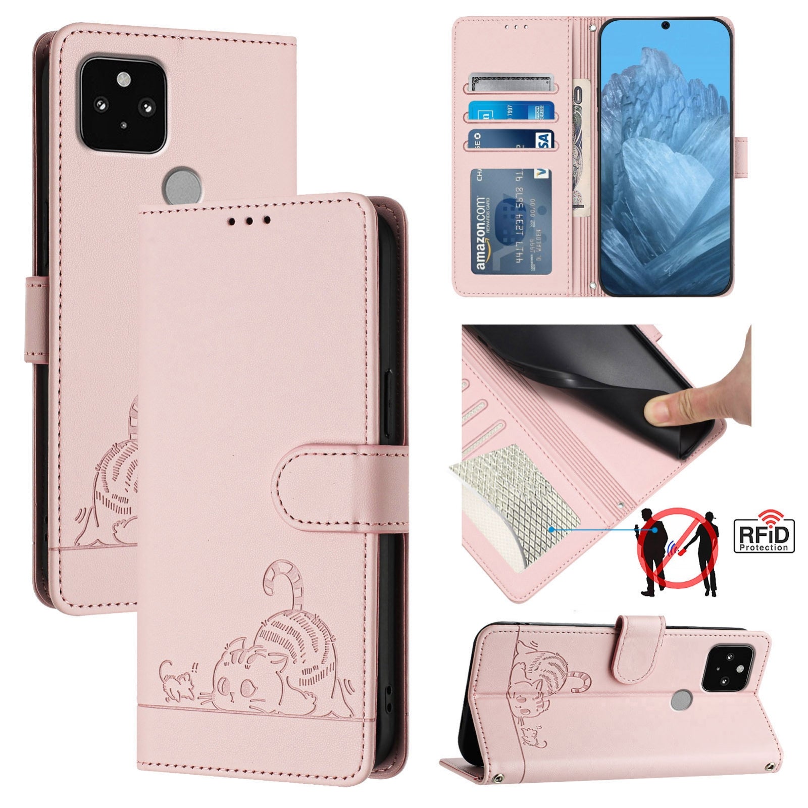 Google Pixel 5 Cat & Rat Embossed RFID Leather Case, Lanyard, Wallet, Card Slots, Kickstand, Anti-Fall, Scratch-Resistant