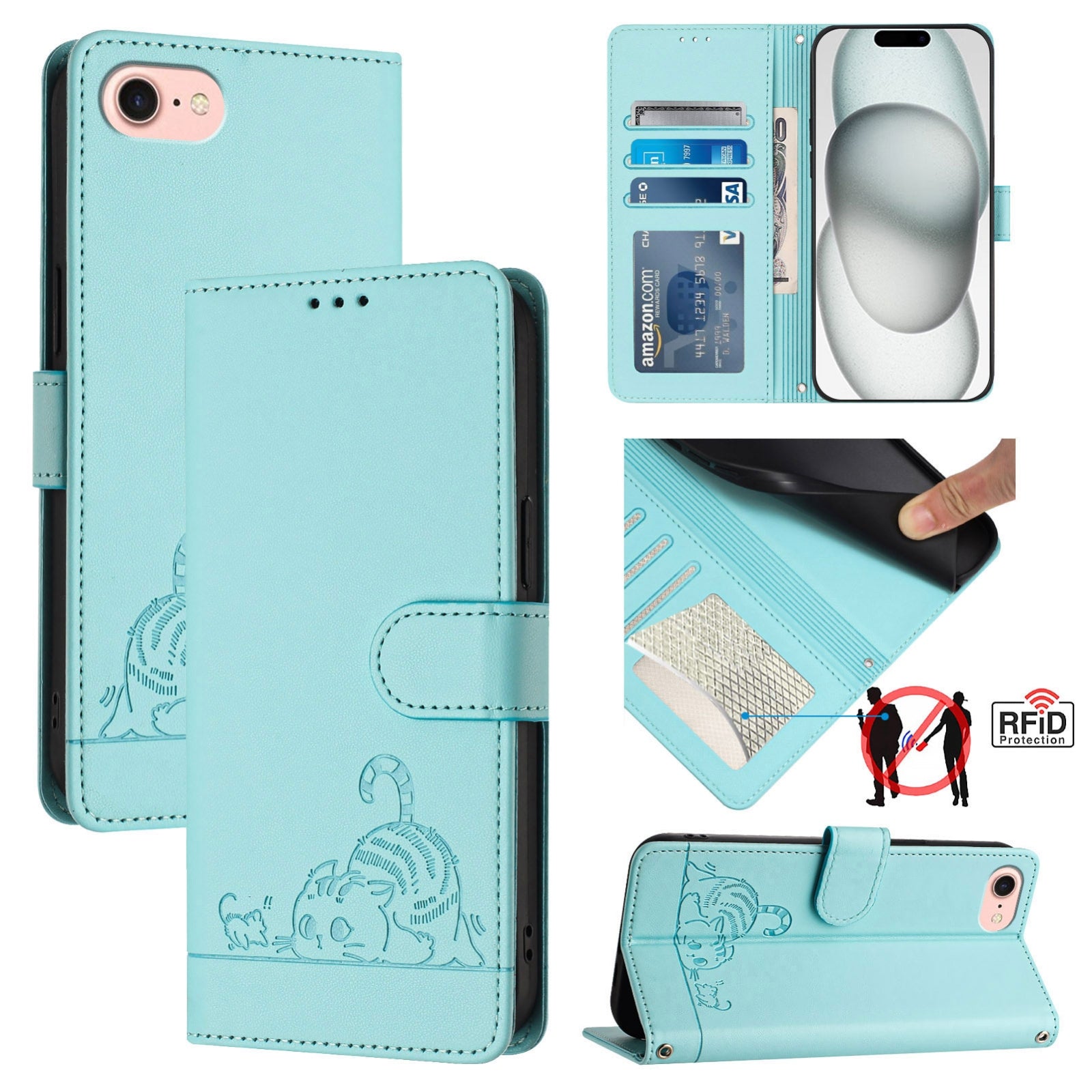 iPhone 6 Cat & Rat Embossed RFID Leather Case, Lanyard, Wallet, Card Slots, Kickstand, Anti-Fall, Scratch-Resistant
