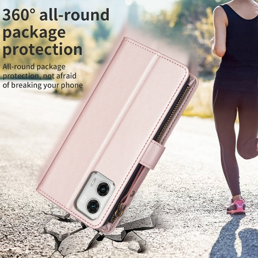Motorola Moto G73 5G Leather Flip Phone Case with 9 Card Slots, Zipper Wallet & Detachable Wristlet Strap