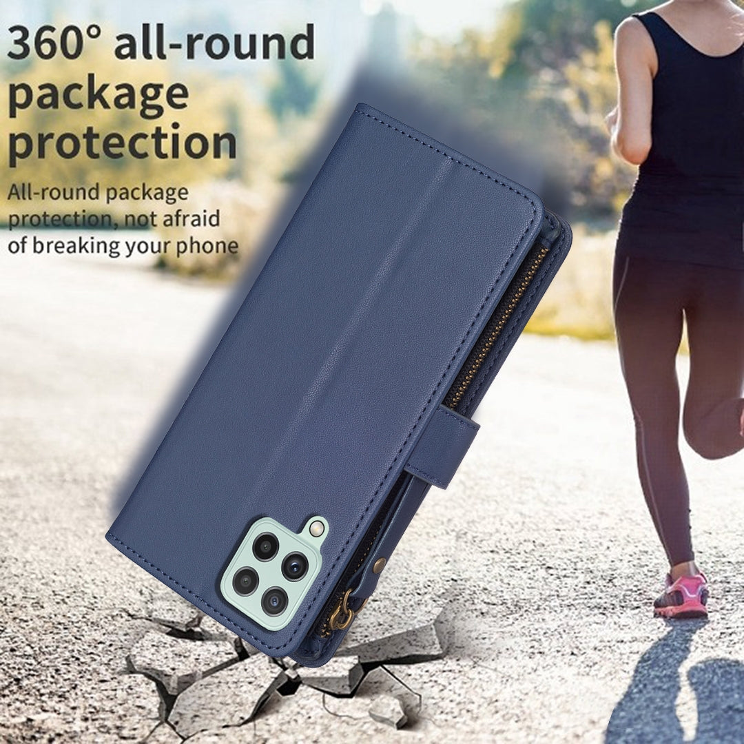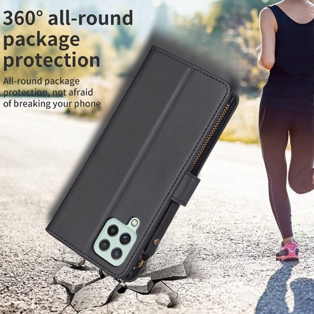 Samsung Galaxy A22 4G Leather Flip Phone Case with 9 Card Slots, Zipper Wallet & Detachable Wristlet Strap