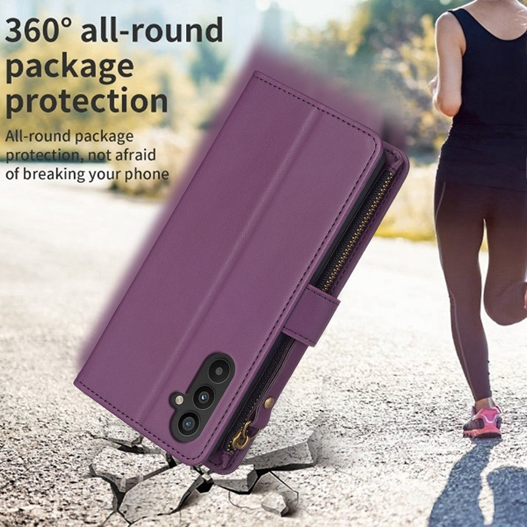 Samsung Galaxy A25 5G Leather Flip Phone Case with 9 Card Slots, Zipper Wallet & Detachable Wristlet Strap