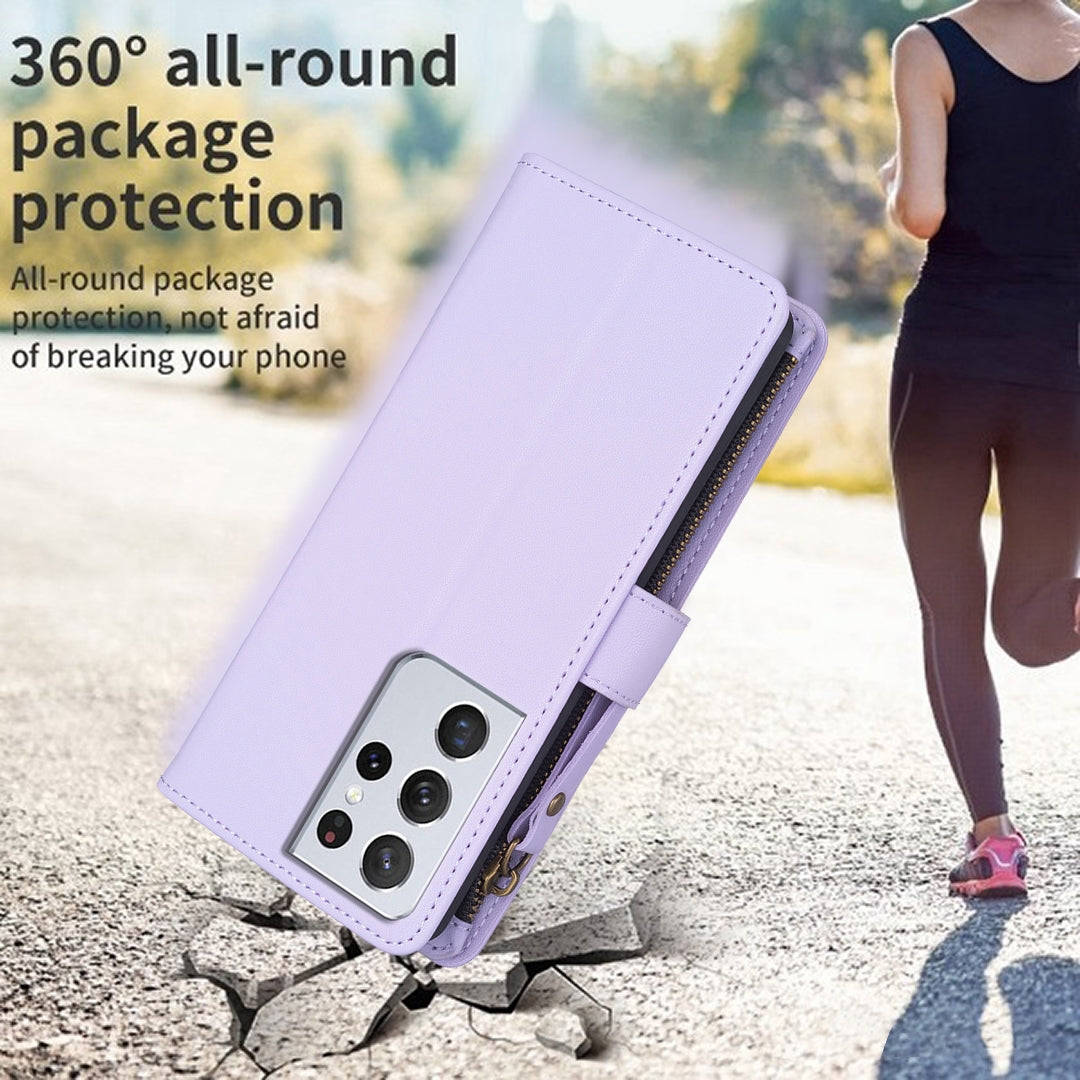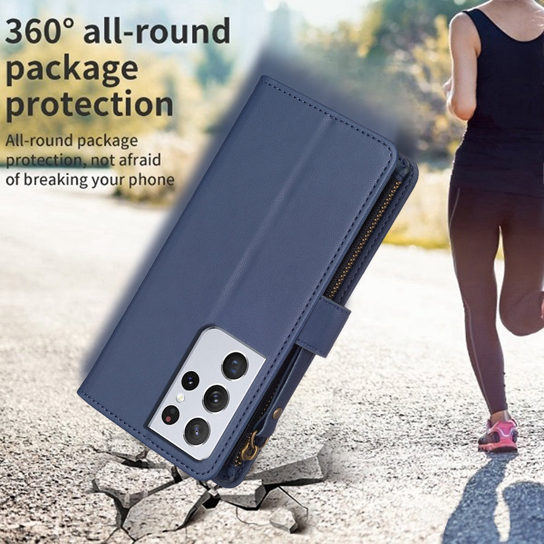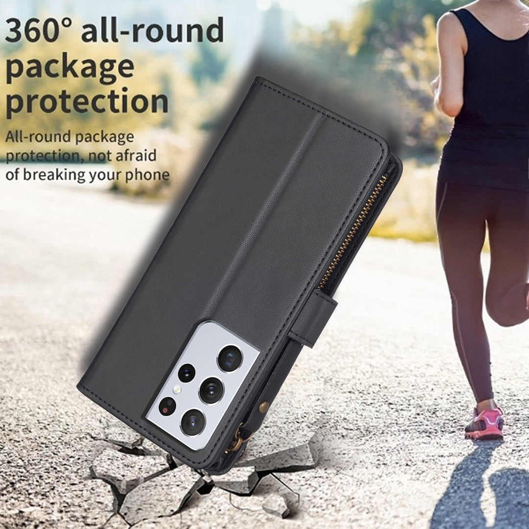 Samsung Galaxy S21 Ultra 5G Leather Flip Phone Case with 9 Card Slots, Zipper Wallet & Detachable Wristlet Strap