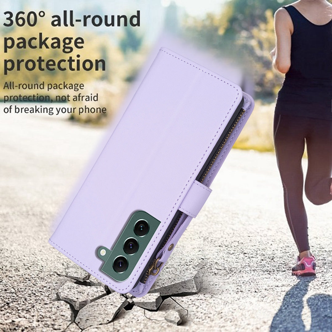 Samsung Galaxy S22+ 5G Leather Flip Phone Case with 9 Card Slots, Zipper Wallet & Detachable Wristlet Strap