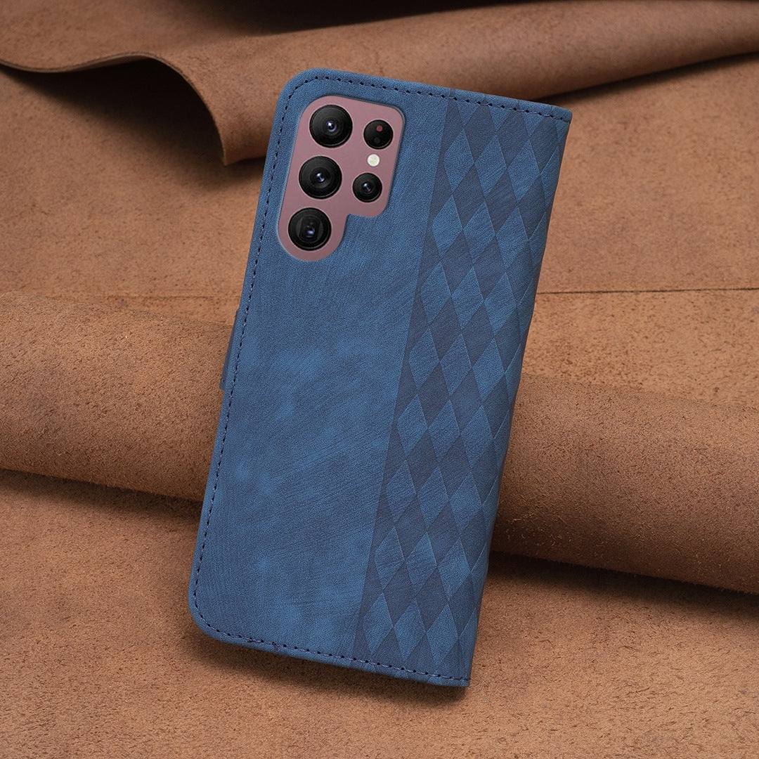 Samsung Galaxy S22 Ultra 5G Plaid Embossed Leather Phone Case – Premium Wallet Kickstand & Shock Absorption for Durable Protection
