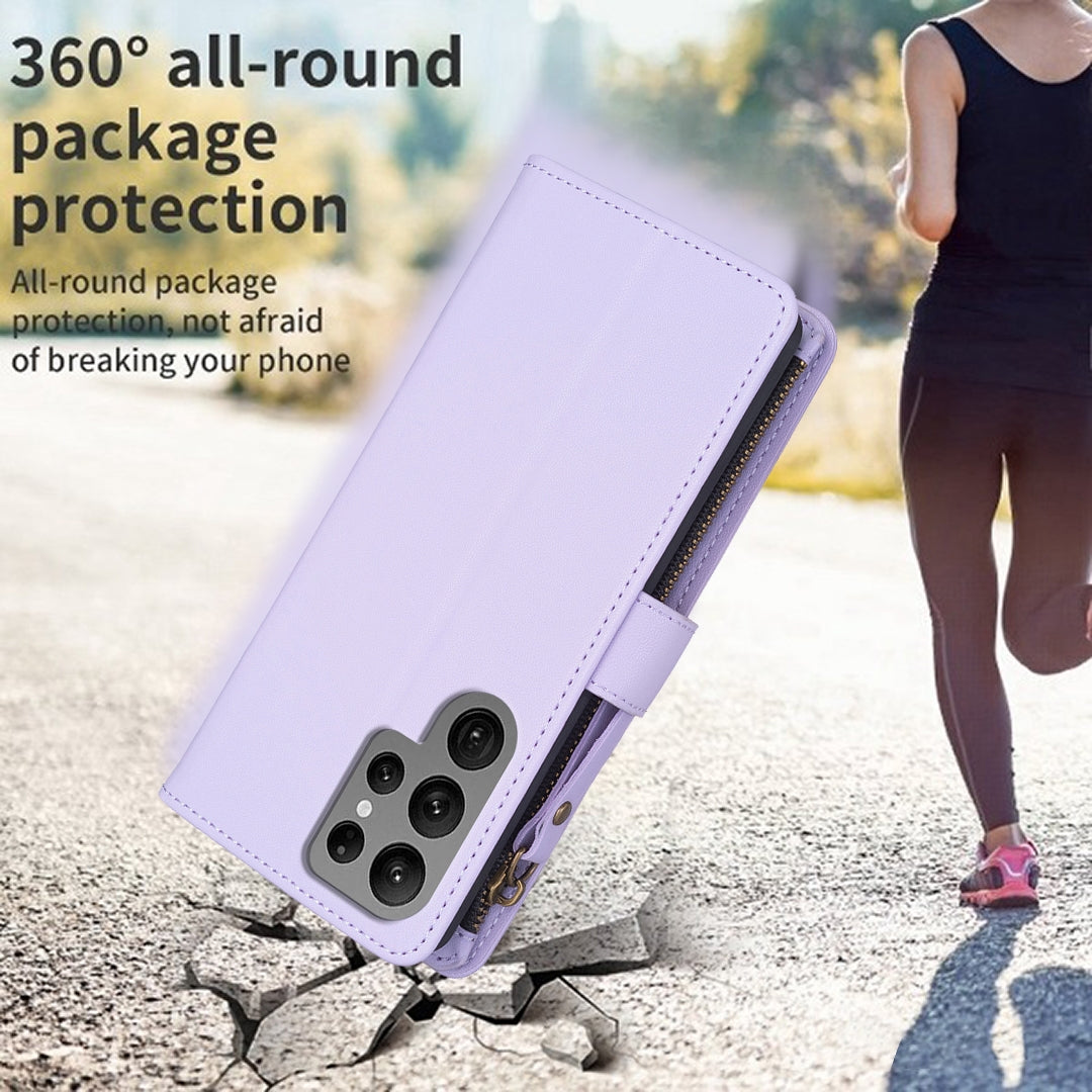 Samsung Galaxy S23 Ultra 5G Leather Flip Phone Case with 9 Card Slots, Zipper Wallet & Detachable Wristlet Strap