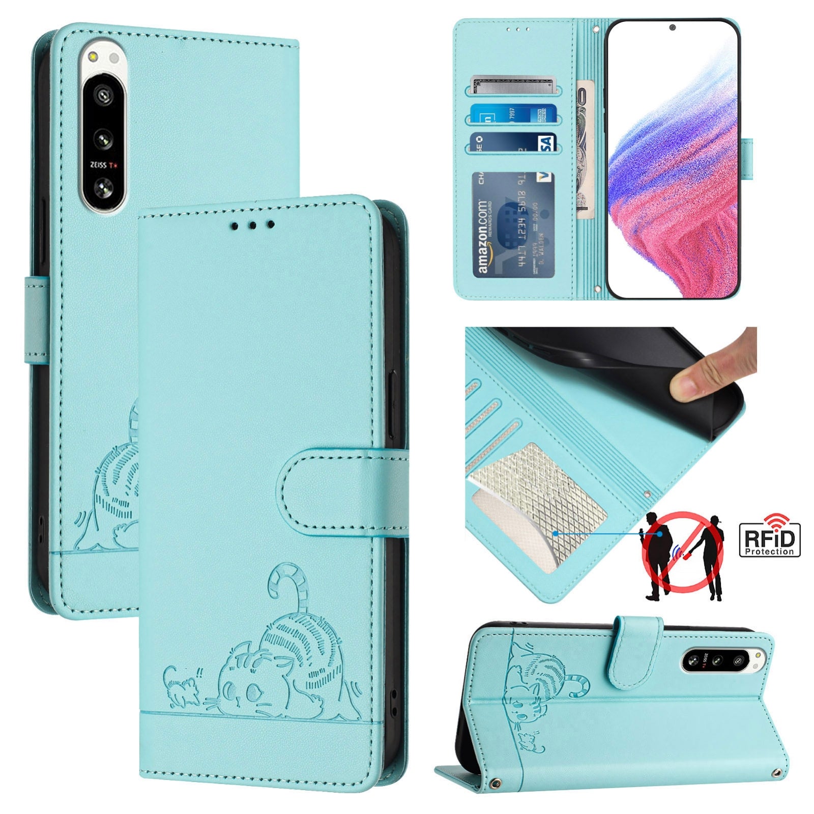 Sony Xperia 5 IV Cat & Rat Embossed RFID Leather Case, Lanyard, Wallet, Card Slots, Kickstand, Anti-Fall, Scratch-Resistant